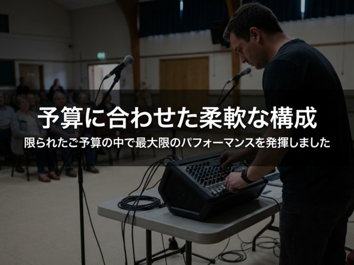 3. 予算に合わせた柔軟な構成 音響は会場の設備をうまく活用し、限られたご予算の中で最大限のパフォーマンスを発揮しました。